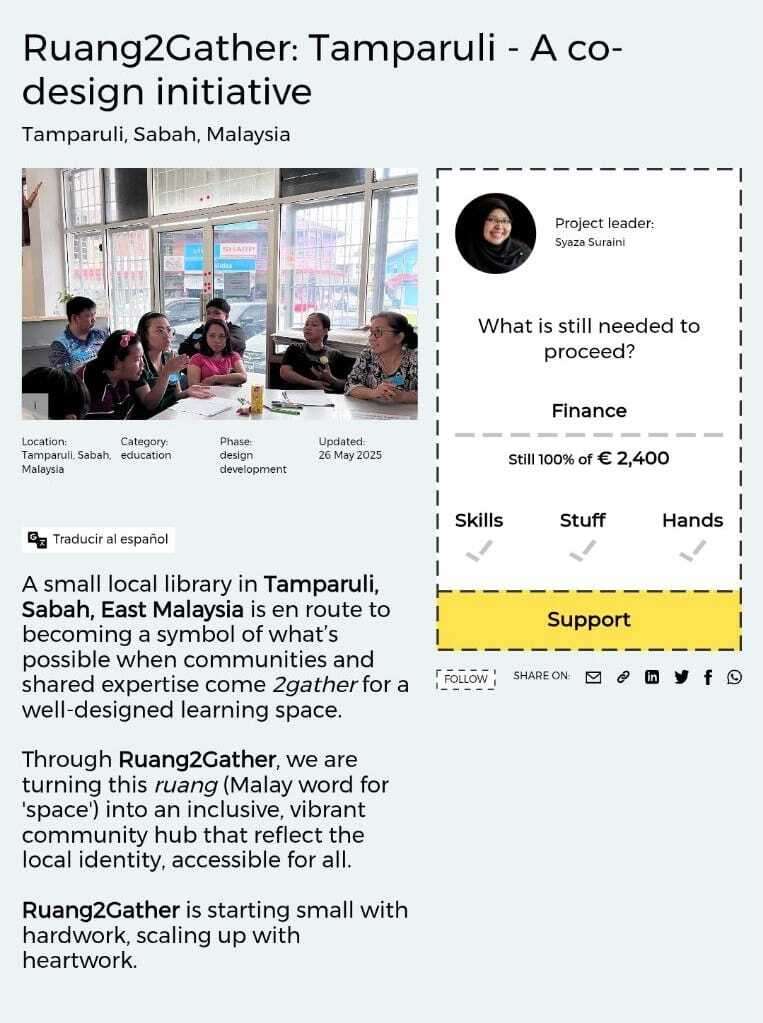 В отдаленном городке Тампарули (Сабах, Восточная Малайзия) небольшая местная библиотека скоро станет не просто хранилищем книг, а настоящим центром жизни сообщества. Проект Ruang2Gather («пространство для объединения») превратит ее в инклюзивное, живое место, отражающее местную культуру и доступное для всех.