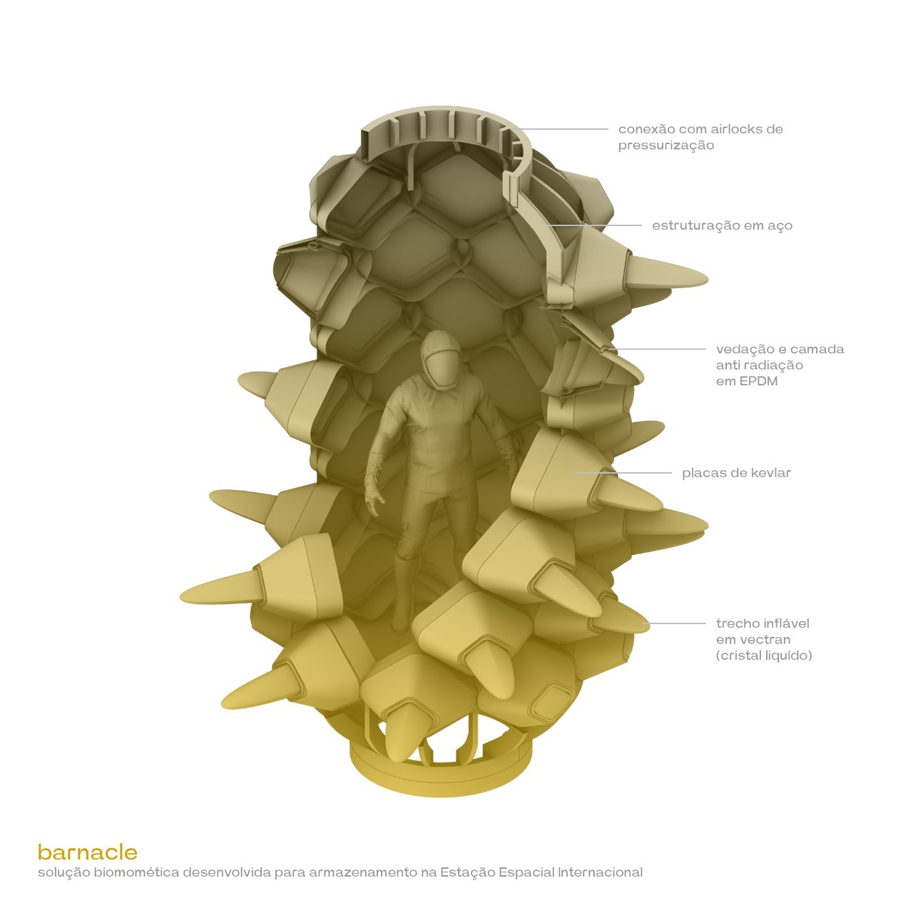 — Идея родилась в ходе обсуждения оптимизации пространства на МКС. Существующие уплотнения станции уже служат складами, но мы хотели улучшить концепцию, перенеся хранилища на внешнюю поверхность. Вдохновением стали балянусы — ракообразные, которые эффективно прикрепляются к корпусам кораблей, не нарушая их структуру. Это позволило создать модуль, который освобождает внутреннее пространство для жизни экипажа, сохраняя защитные свойства.
