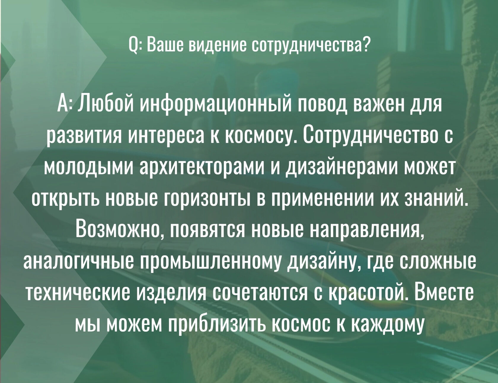 Любой инфоповод важен для развития интереса к космосу. У молодых архитекторов и дизайнеров, как и у молодых инженеров и конструкторов впереди большое будущее. Ваши знания будут использованы в важном для отечественной и мировой космонавтики направлении. Возможно, мы создадим новые совместные направления по аналогии с промышленным дизайном. Всегда считал, что сложное техническое изделие должно быть еще и красивым, с этим у нас еще надо работать.