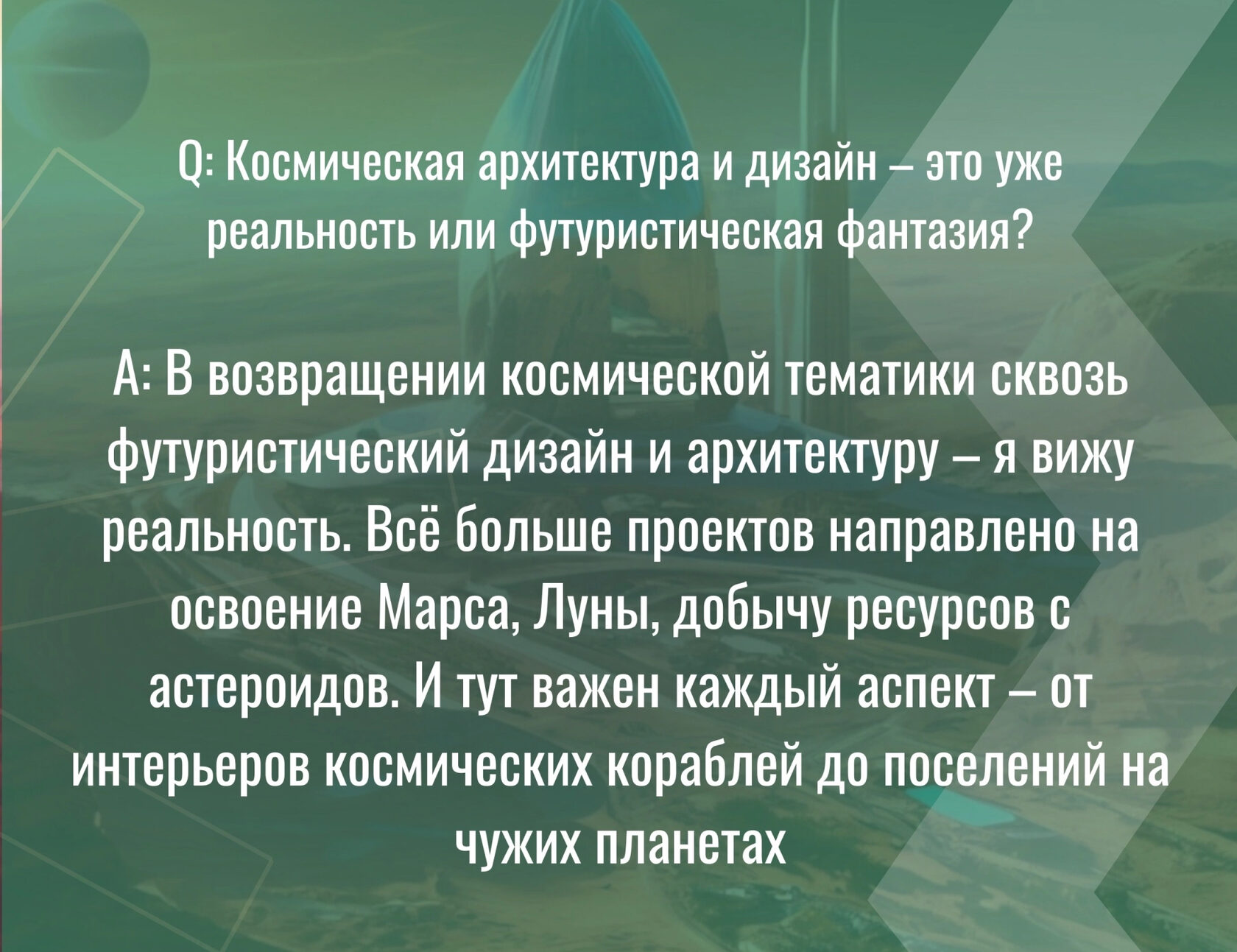 История развивается по спирали, после первого спутника и первого полета Ю. А. Гагарина в космос многие узнали о космических программах и проектах нашей страны. Каждый в своей области хотел хоть капельку приблизиться к космическим проектам и поэтому космос нас окружал везде: в дизайне автомобилей и интерьеров, в моде, кино, бытовых предметах, личных аксессуарах и т. д. После некоторого спада сейчас возвращается популярность космического направления и, на мой взгляд, космический и футуристический дизайн также способствует этому. Космическая архитектура и дизайн это один из способов популяризировать космическое направление Активно развиваются направления по колонизации Марса, Луны, добычи ископаемых из астероидов, но ведь для этого нужно строить и космические корабли и готовить соответствующую инфраструктуру для проживания. Прошло то время, когда космонавты довольствовались малым жилым пространством, а внутренняя отделка носила больше функциональный смысл, нежели радовала глаз. Длительность полета от Земли на Марс, к примеру, потребует создание интерьера космического корабля, где будет учитываться и цветовая гамма и удобство и функциональность, да и красота тоже. Ну а на Марсе что мы будем строить? Коттеджи? Конечно нет, вот тут-то и понадобятся талантливые дизайнеры и архитекторы, которые совместно с инженерами создадут новый дом для покорителей космоса.
