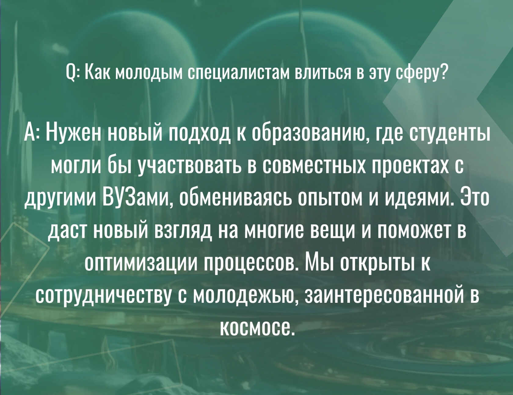 Здесь нужно пересматривать подход к образовательному процессу. В период получения высшего образования студенты варятся в своем окружении и практически не происходят контактов с другими ВУЗами. Нужно на государственном уровне создавать условия для развития совместных проектов, это позволит посмотреть на многие процессы и подходы совсем с другой стороны. Архитектор будет взаимодействовать с конструктором, конструктор с дизайнером или врачом и т. д. Все это может привести к интересным и нужным результатам, в том числе и к оптимизации многих процессов и ресурсов. Все, кто хочет приблизиться к космосу, будем рады видеть на наших мероприятиях и в нашем канале. Мы можем обсудить что именно Вам нравится, определить направления для Вашего развития и познакомить с наставниками из космической индустрии.