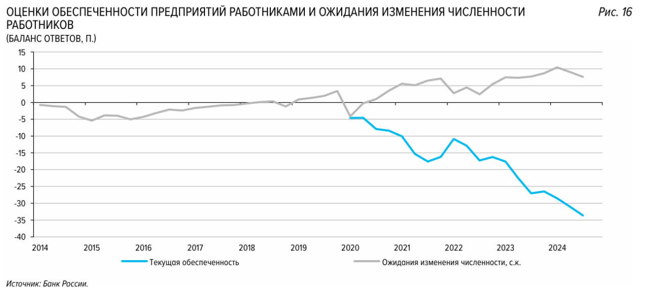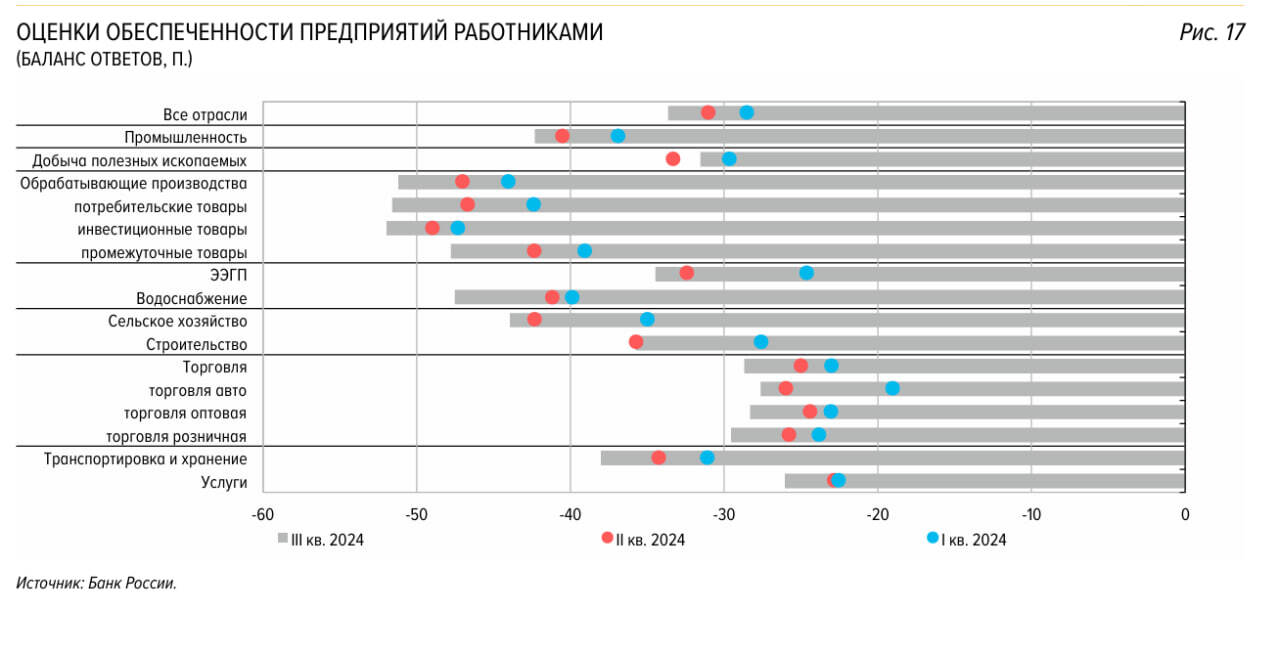 В III квартале 2024 года уровень обеспеченности работниками упал до -33,6%. В стройке цифра еще ниже, -36%, но она осталась на уровне II квартала.